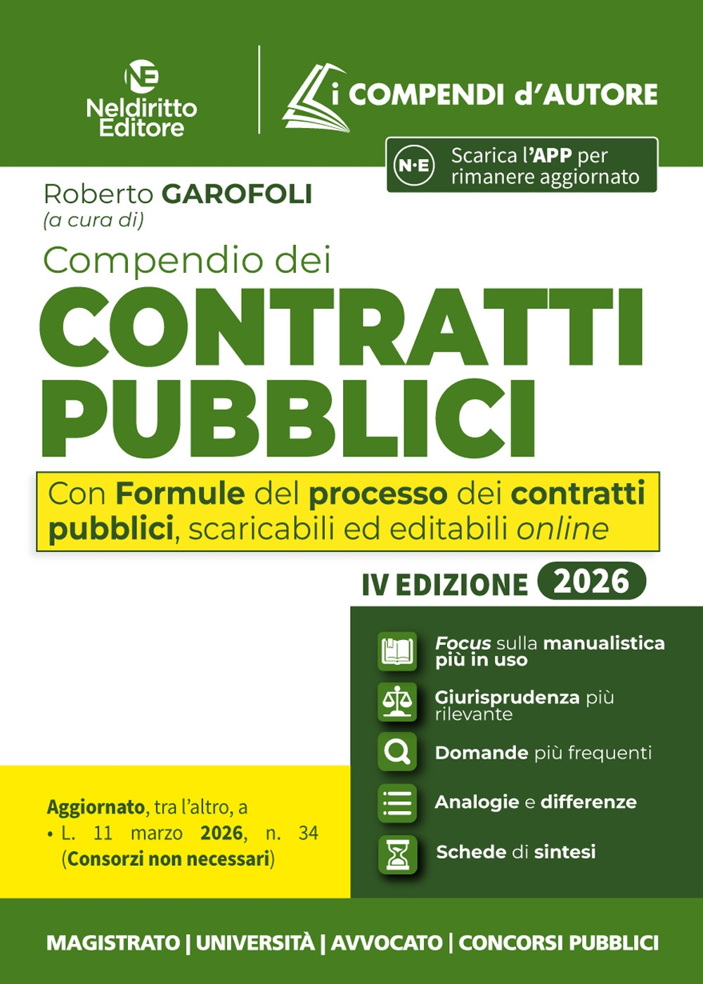 Il Compendio dei Contratti pubblici Neldiritto Editore 2026 si conferma, pertanto, un utilissimo strumento di approfondimento della nuova disciplina dei contratti pubblici per avvocati, magistrati, stazioni appaltanti, imprese, operatori del settore, nonché per chi intende prepararsi ai concorsi superiori, come quello in magistratura. La collana I Compendi d”Autore da circa 20 anni è punto di assoluto riferimento per chi prepara gli esami universitari o le prove di abilitazione forense e dei principali concorsi pubblici. A caratterizzare la Collana sono la chiarezza nella forma, la sinteticità abbinata a completezza nella sostanza. Nell”Edizione 2026 veste grafica, struttura e contenuti sono stati profondamente rivisti per rispondere ancor più efficacemente alle esigenze di chi si prepara. Sul piano grafico, box, grassetti, elenchi puntati, rendono lo studio e la memorizzazione assai più agevoli. Numerosi i nuovi contenuti. L”intera trattazione è attentamente ricalibrata tenendo conto delle domande più frequenti negli esami universitari e nelle prove dei principali concorsi pubblici. È riportata e citata in appositi Focus dottrinali la Manualistica più utilizzata nelle Università, così da assicurare una preparazione completa. Si dà inoltre atto in Box giurisprudenziali degli orientamenti interpretativi più rilevanti; Per i principali istituti, sono messe a fuoco in ulteriori Tabelle, le Analogie e le Differenze per una conoscenza sistematica della materia. Per agevolare il ripasso sono, infine, inseriti in chiusura dei capitoli due ulteriori strumenti: le Schede di sintesi, utilissime per consolidare le conoscenze acquisite; le Domande più frequenti, per saggiare la preparazione. Il Compendio dei Contratti pubblici, giunto alla IV Edizione, è stato rivisto e aggiornato alle più recenti novità normative intervenute a modificare il Codice e gli Allegati, in particolare quelle introdotte dalla L. 11 marzo 2026, n. 34 (Consorzi non necessari), dalla L. 30 ottobre 2025, n. 164 (criteri aggiudicazione contratti pubblici) e dai Regolamenti (UE) 22 ottobre 2025, nn. 20252150, 20252151 e 20252152 (c.d. soglie di rilevanza europea). Numerosi gli spunti tratti dal più recente dibattito giurisprudenziale. Il Volume è arricchito da un”Appendice online, recante un”accurata selezione di Formule del Processo in materia dei contratti pubblici e corredate da un minuzioso apparato di note ed avvertenze. Le formule sono scaricabili ed editabili online. Il Compendio dei Contratti pubblici Neldiritto Editore 2026 si conferma, pertanto, un utilissimo strumento di approfondimento della nuova disciplina dei contratti pubblici per avvocati, magistrati, stazioni appaltanti, imprese, operatori del settore, nonché per chi intende prepararsi ai concorsi superiori, come quello in magistratura.